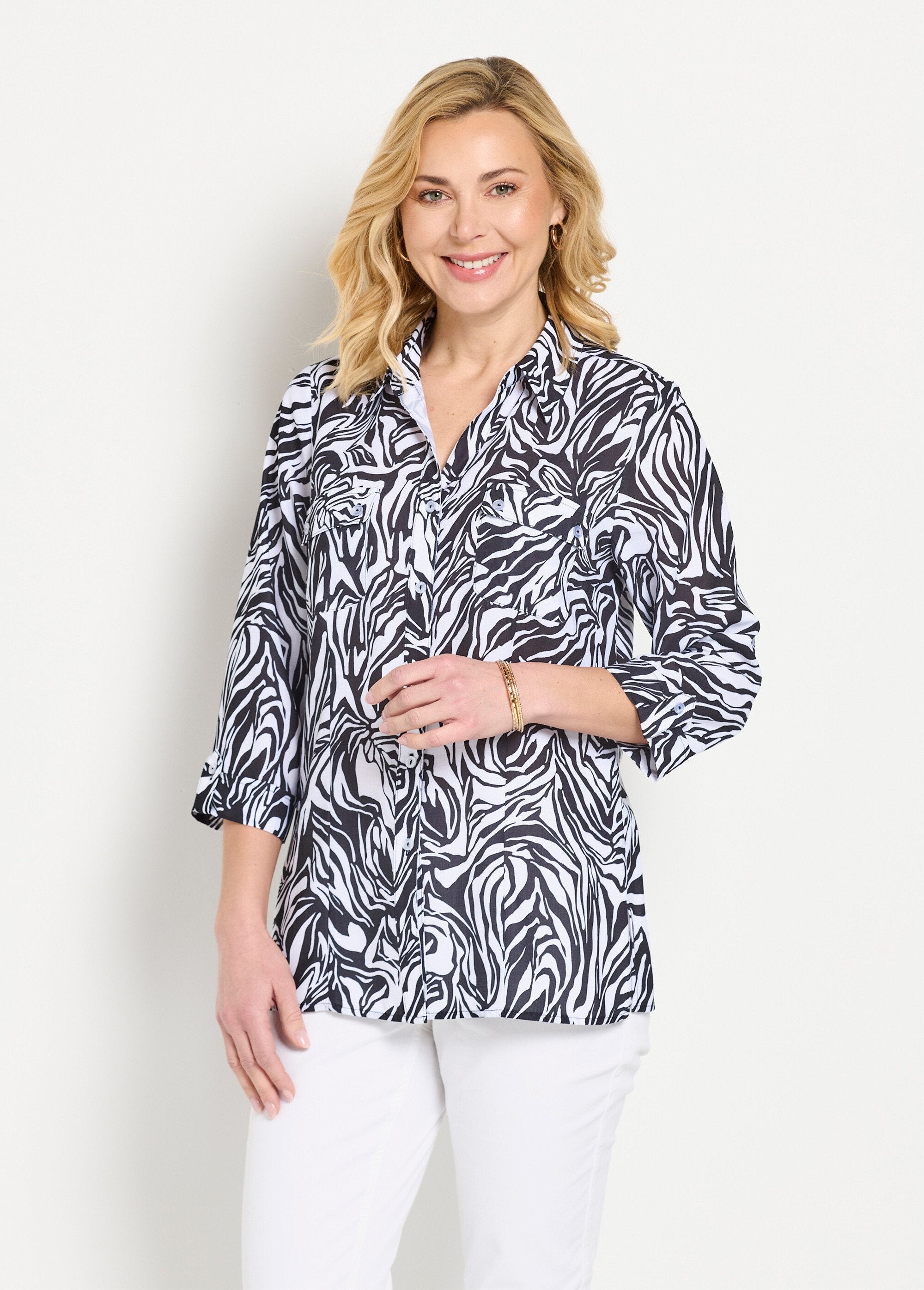 Long_buttoned_blouse_with_3/4_sleeves_in_animal_skin_Black_and_white_GA1_slim
