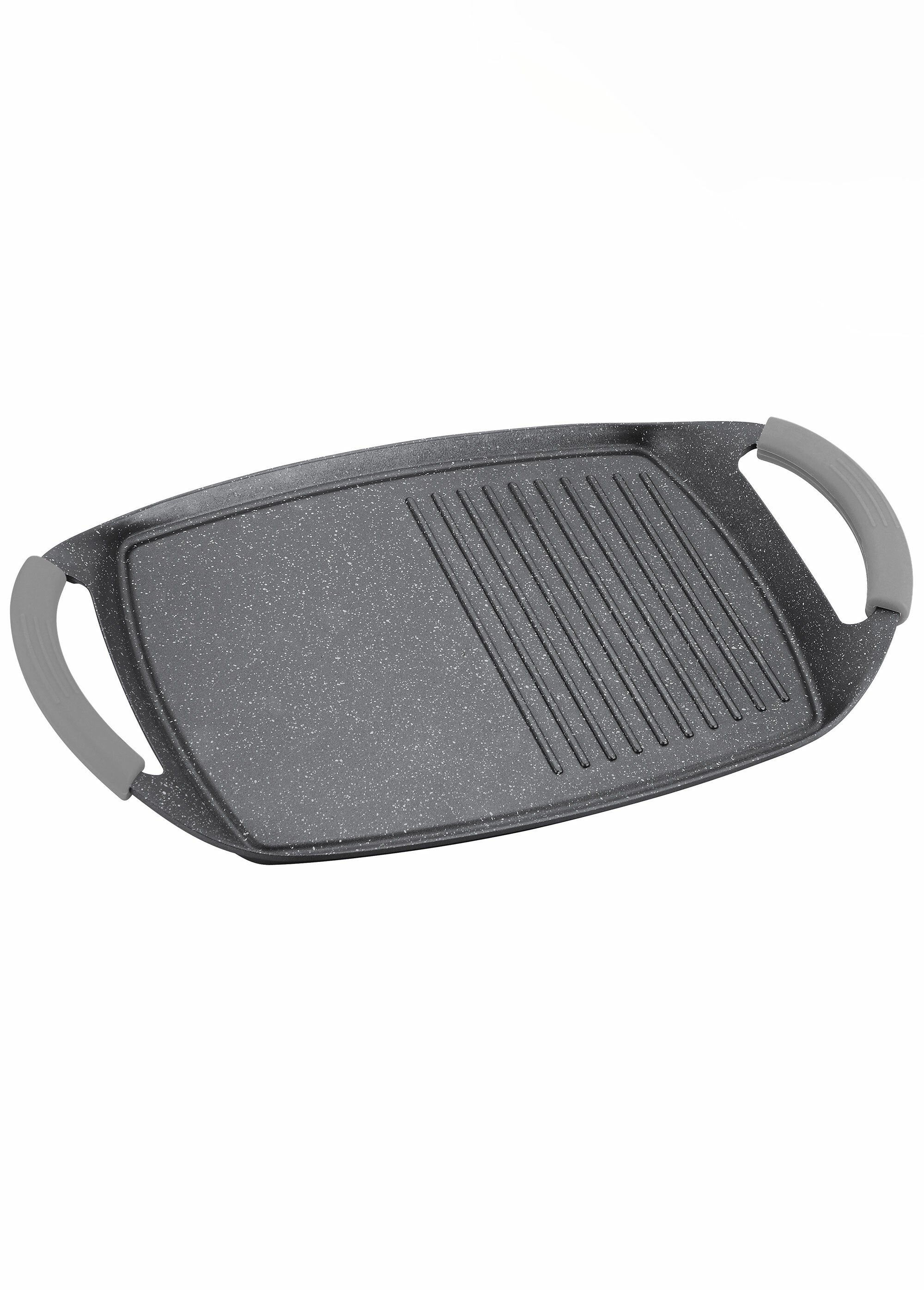 Plancha grill 47 x 29 cm, induction disc 19.4 cm - Made of die-cast aluminum in one piece - Greblon® C2+ non-stick coating with 2 layers of reinforced stone effect ceramic - PFOA free - Easy to clean - Supplied with a pair of anti-heat silicone handles - Suitable for all types of cookers, including induction. The "Maestro" series of kitchen utensils is ultra resistant to abrasion, which allows cooking with little or no fat. It is ideal for making simmered dishes successfully. The non-slip soft touch handle is ergonomic, which provides a comfortable grip. The tempered glass lid can be used in the oven to finish recipes or keep food warm. The drip cap allows you to add aromatic broth without lifting the lid, preserving flavors. In addition, there is an anti-heat silicone protection on the cap.