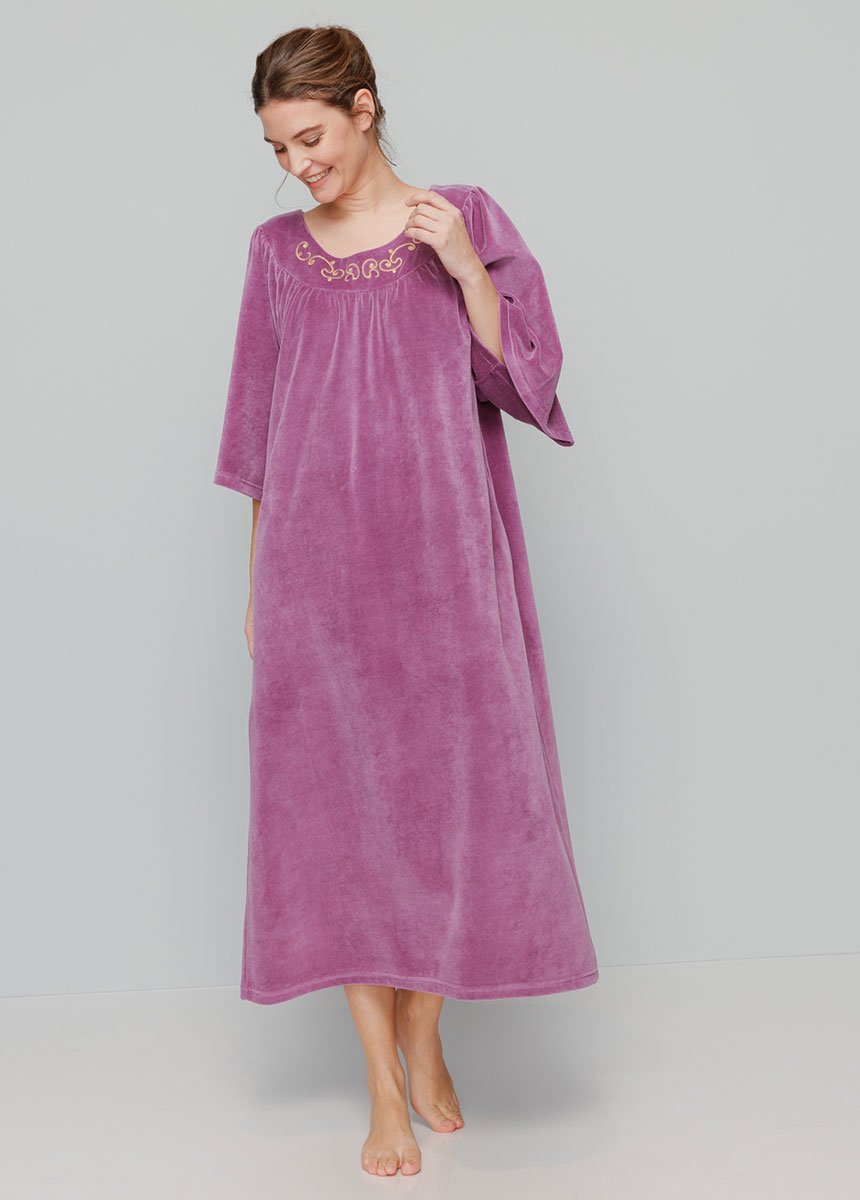 Ease and refined elegance share the spotlight on this hostess dress made from a beautiful quality of velvet. A flattering line, which displays its charms in the gathers distributed under the rounded yoke enhanced with superb gold embroidery and in the beautiful fullness of the semi-raglan elbow sleeves. Double stitched finishes at the base and bottom of the sleeves. Long approx. 125 cm. Washable 30°C. Velvet knit 80% cotton, 20% polyester.