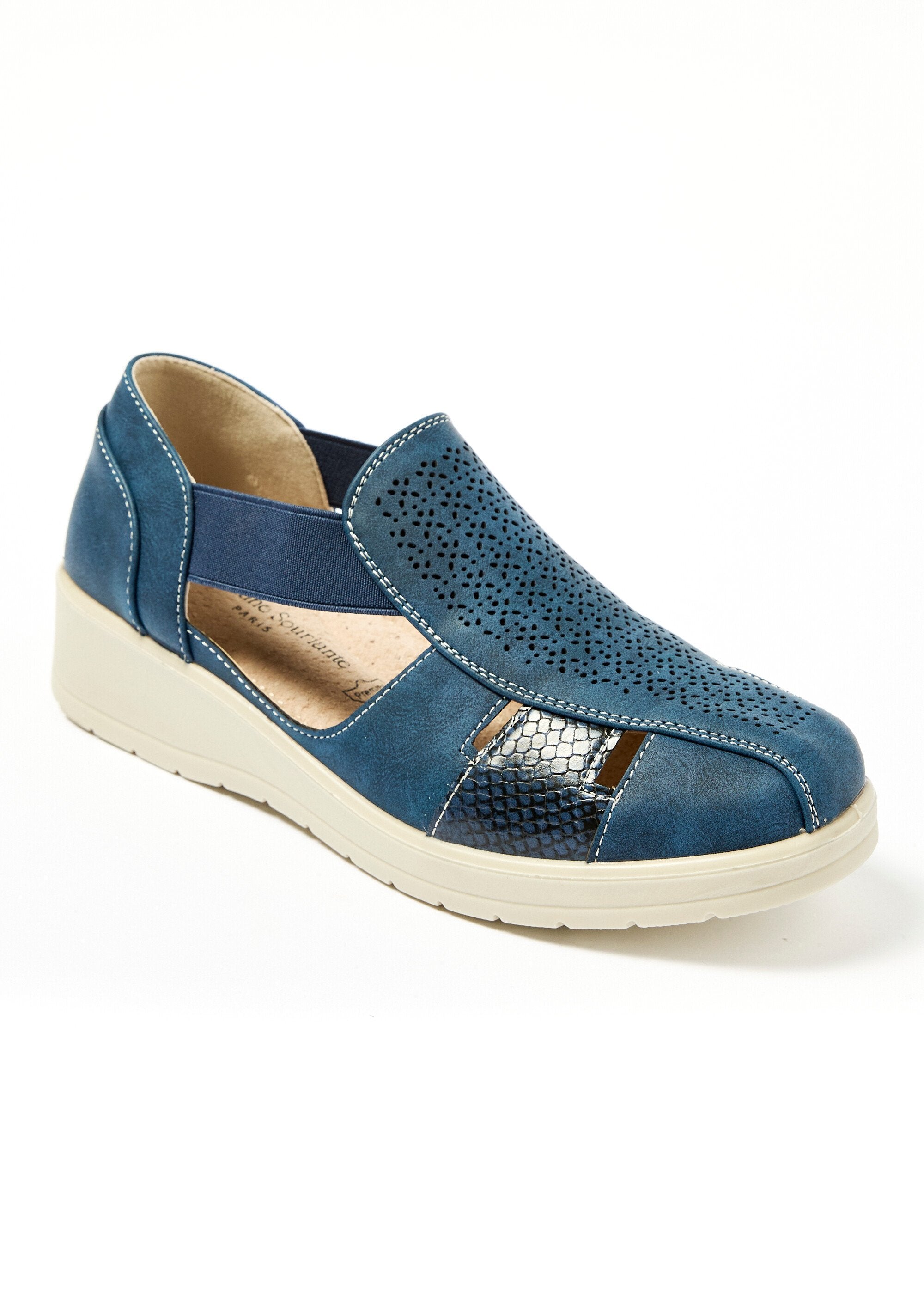 These suede-look sandals slip on quickly thanks to their elastic straps, ensuring a perfect fit with every step. The interplay of multiple material finishes and decorative stitching add a touch of originality to their design. Ideal for those looking to combine comfort and style, these wedge sandals are perfect for active days.